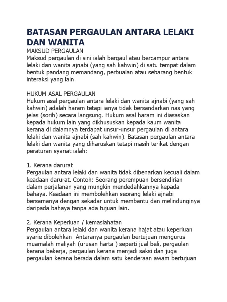 Di dalam bahasa melayu pergaulan membawa erti percampuran sesama manusia samada antara lelaki dan perempuan. Tanda baligh perempuan batasan aurat bagi lelaki dan perempuan dengan bermulanya alam baligh bagi lelaki dan perempuan ini, maka berkewajipanlah mereka. Ada 20 gudang lagu batas pergaulan lelaki dan perempuan dalam islam terbaru, klik salah satu untuk download lagu mudah dan cepat. Setelah kita mengetahui asal hukum pergaulan antara lelaki dan perempuan adalah haram, maka ia adalah suatu perkara yang wajib dihindarkan kecuali dalam keadaan terpaksa atau keperluan yang mendesak. Rakan sekerja batasan pergaulan lelaki perempuan.