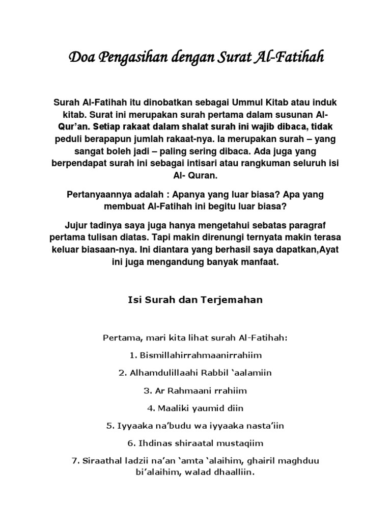 Allah adalah nama untuk rabb yang maha banyak berkahnya lagi maha tinggi, dzat yang berhak diibadahi yang tidak ada yang lain. Bukan (jalan) mereka yang dimurkai, dan bukan (pula jalan) mereka yang sesat. Surah al fatihah version 2. 70 kali setiap hari, ditunaikan hajat, dimenangkan dari musuh dan pendengki. Surah ini diturunkan di mekah dan terdiri dari 7 ayat.