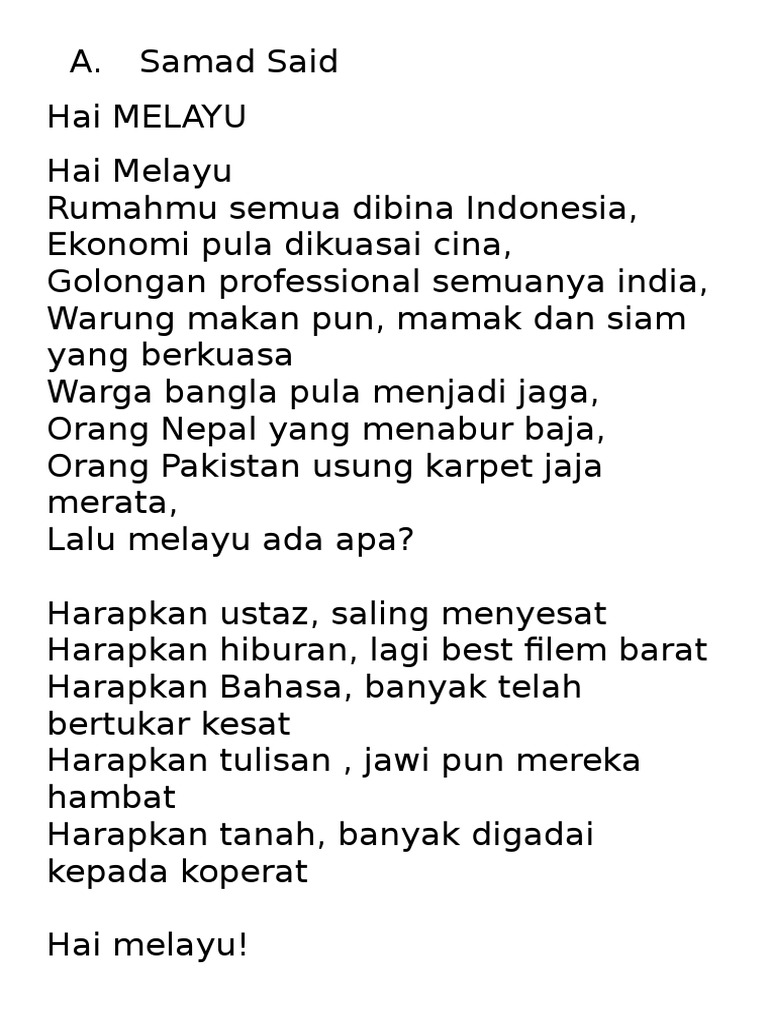 Puisi A Samad Said Malayfina from 1.bp.blogspot.com Beli novel salina dan bertemu pak samad. Listen to a samad said | explore the largest community of artists, bands, podcasters and creators of music & audio. Includes midi and pdf downloads. Deklamasi sajak oleh a samad said di himpunan sayangi malaysia. A.samad said skrev inden for næsten alle områder af litteratur og kreativ skrivning. Wokyoh samad said terbaru berangan nak jadi kaya part 1 malay subb. Puisi hidup bersama oleh datuk a. Peludah warna kuasa gusar kini menggelegak murka, warna kuning diisytihar racun terbisa.