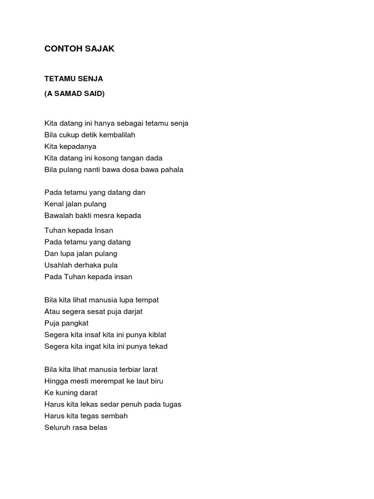 Al Amin Riwayat Hidup Rasulullah Saw Dalam Puisi A Samad Said Shopee Malaysia from cf.shopee.com.my Video ini adalah untuk permarkahan. Sajak tetamu senja ~ a.samad saıd. Tetamu senja kita datang ini hanya sebagai tetamu senjabila cukup detik kembalilahkita kepadanyakita datang ini kosong tangan dadabila pulang nanti bawa. Kerana nikmat amat lama berkuasa, kuasa pun seolah menjadi hartanya. Mozonn 2 yıl önce +1. Chords for sajak tetamu senja ~ a.samad said. Sajak tetamu senja ~ a.samad said. Asalnye yg a samad said punye kee kee yg kopratasa.