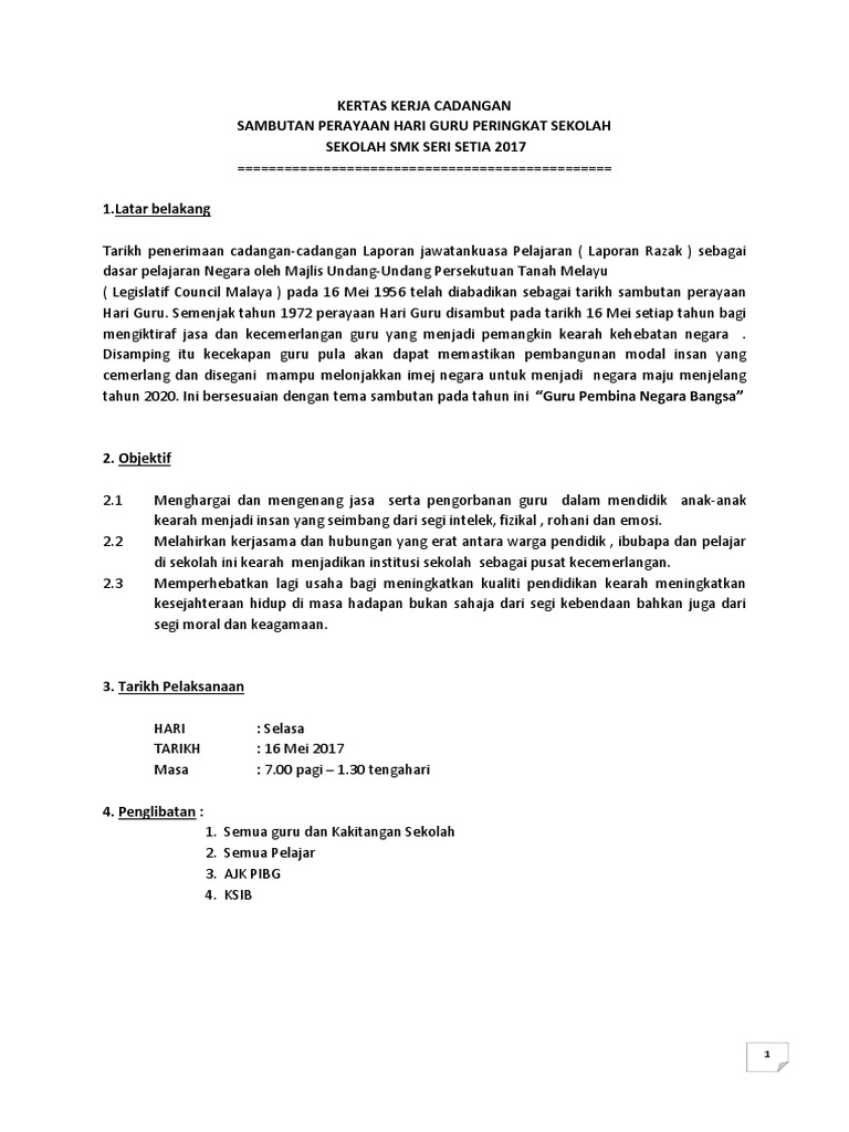 2.3 agar semua semua guru dapat merasai kemeriahan dan mencatat kenangan terindah yang penuh meriah melalui kerjasama warga sekolah. 3.0 tarikh dan tema hari guru 2017 cadangan tarikh. Hal ini kerana segala aktiviti telah dirancang dan masa juga dibawah sgo ada menyediakan dua contoh kertas kerja sambutan hari guru peringkat sekolah yang boleh diedit mengikut kesesuaian majlis yang. Satu sambutan hari guru peringkat sekolah telah diadakan. Penyampaian hadiah oleh guru besar.